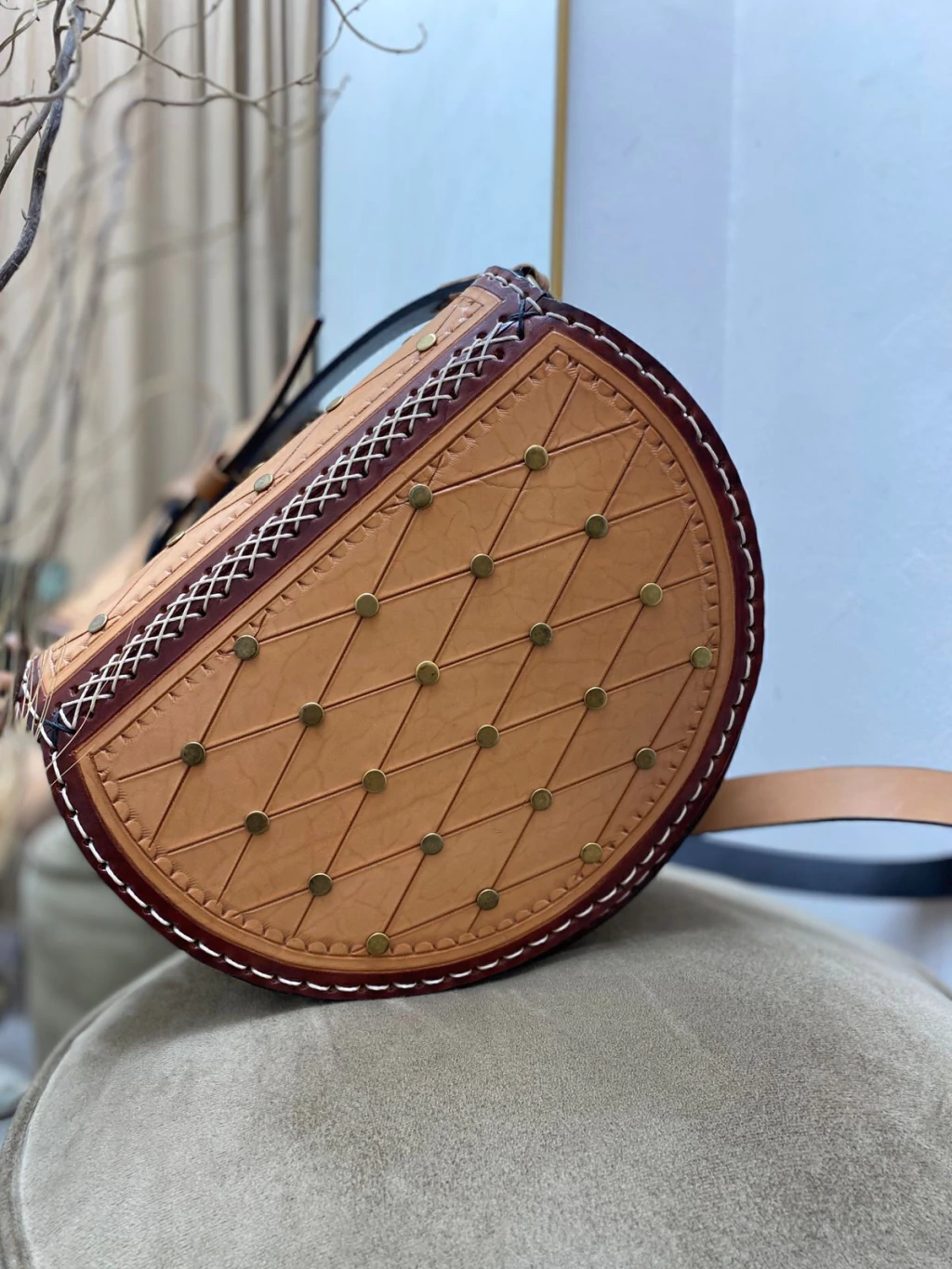 La cartera tachas es realizada en cuero vaqueta